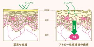 アトピー性皮膚炎は、その原因は定かではありませんが、ほこりやダニ、外部の刺激、遺伝子要因など、なんらかの理由で皮膚の刺激に対するバリアが壊れ、アレルギー物質や刺激が体内や血管内に入り、それに対する反応や炎症がでる症状だと言われています。